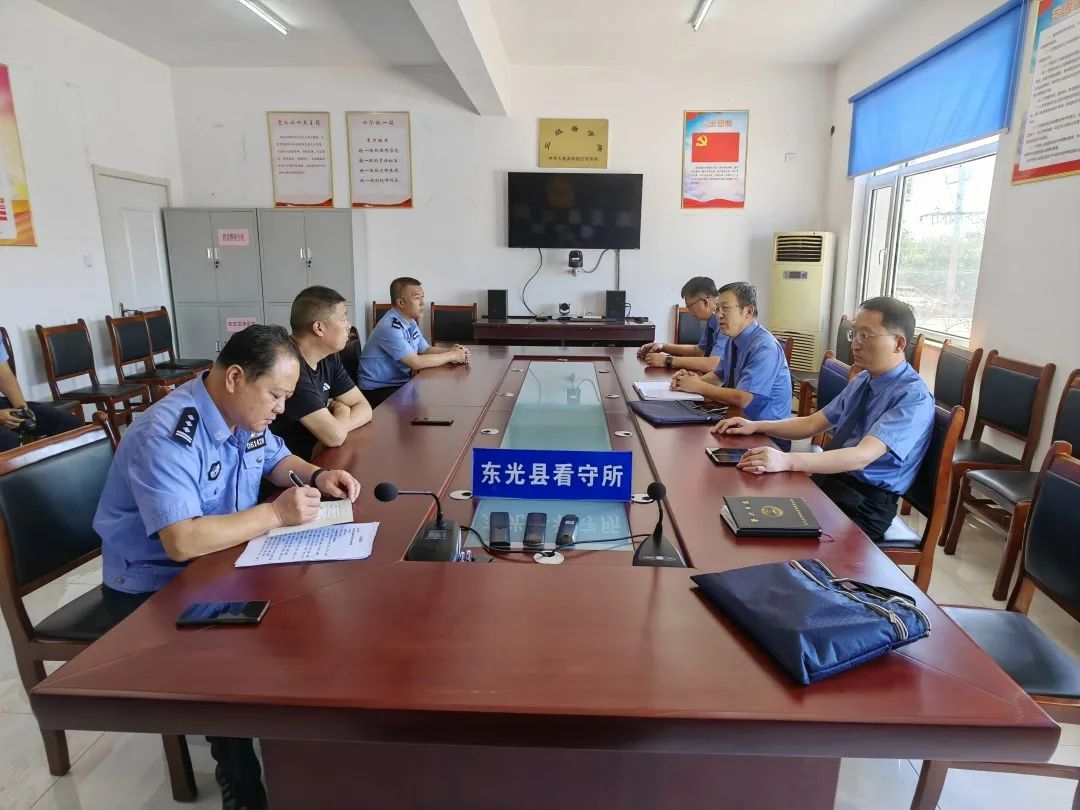 2023年“双节”将至,东光县人民检察院驻所检察干警于近日到东光县看守所进行全面安全稳定大检察,并与县公安局党委委员、副政委马天佑,县看守所所长李跃安及看守所有关干警进行座谈,深入交流问题整改措施及时限。检察干警对东光县看守所监区、监室、食堂、医务室等重点区域进行检查,对电子围挡、钢筋网、消防器材、监控、报告装置等设施设备进行查看、试用,检查高风险在押人员械具使用,身体心理状况,抽查有无违禁品,查阅安全检查记录、医生巡视诊治日志等档案材料。